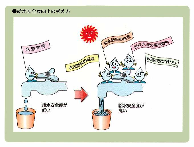 - 常に安定した給水を確保するために、貯水施設、取水施設、導水施設から浄水施設までの信頼性を向上させる。