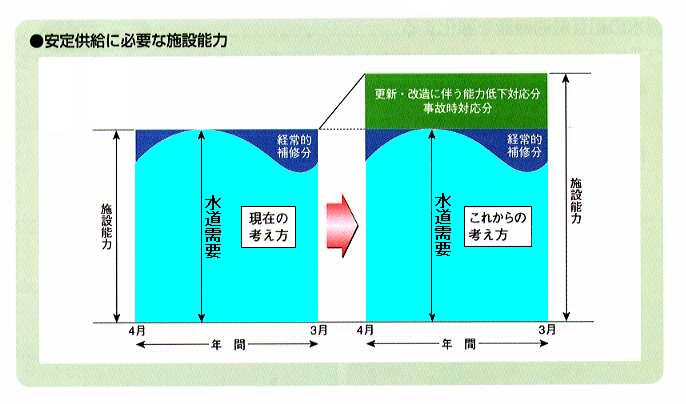 - 施設の更新・改造時における長期的な施設能力の低下に備え、安定して給水できるゆとりある施設能力を確保する。