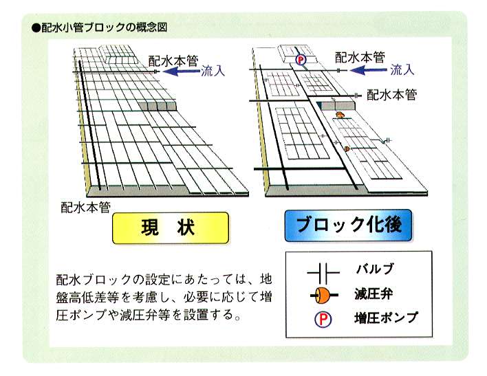 - 平常時の水圧の均等化、震災時の復旧の効率化などを図るため、配水区域のブロック化を推進する。